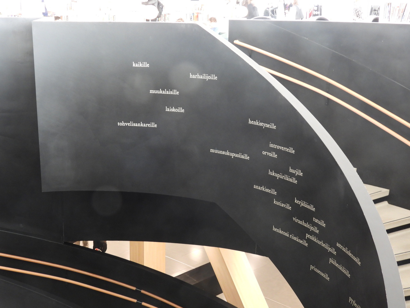 The language is indeed unusual. Finnish does not use prepositions, so modifiers are just attached to a word, making it longer and longer. Two examples are below. The sign on the left tells you this is a ‘private road’. On the right is the artwork in the stairwell at Helsinki’s beautiful new Oodi library. It lists the answers received to an online survey asking “who should the library be designed for?”. One of the longest words, in the middle, means ‘the people who’ve written their ideas on whiteboards’.