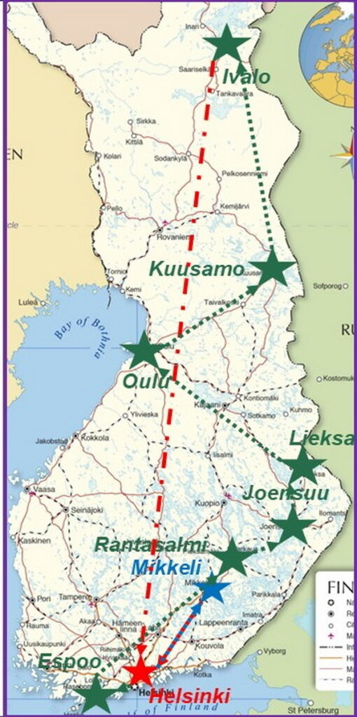 The map shows Helsinki with a red star, at the south end of the country. The green stars and arrows show the path of our birding trip. The blue star and arrow show where we went for the fishing expedition.