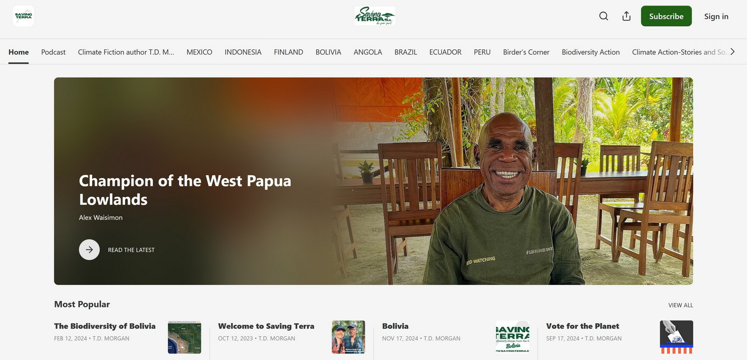 Since its beginning, Terry has steered Saving Terra toward a celebration of bird diversity in all corners of the world and – at the same time – an awareness of the threats birds face, particularly in the global south.  Both foci are inspired by our travels to foreign lands.  This year our trips to southern Mexico, Finland and our 8-week tour of Indonesia have been featured in Saving Terra.  Terry has added a new section to the substack, Champions of Biodiversity, to showcase the contributions of local individuals to the preservation of biodiversity.   In 2026, we travel to Ecuador, Panama, Tanzania and Zambia, all of which will provide a wealth of material for Terry’s substack.   In Tanzania, we will return to Tarangire National Park and its elephants, the original inspiration for Terry’s novel Tarangire Dreams.  Terry continues to work on changes to the novel for a second edition, as well as a movie screenplay.