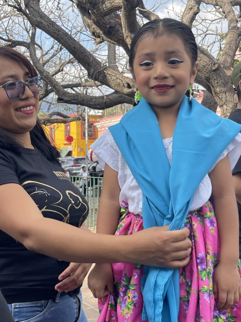 Oaxaca is a major tourist destination, with over 2.3 million visitors in 2019. Interestingly, international tourists are a small share of that total (less than 20%). But the community also includes many places where Oaxaceños live their lives. Over 700,000 people live in the metropolitan area here and their lives include their own celebrations. We visited a small event venue (for a very cool mezcal and molé paired tasting) in the Jalatlaco neighborhood. We needed two cabs to take us back to central Oaxaca. While we were waiting for them, we noticed unusual preparations underway in the main plaza. Parents were helping young children dress in very elaborate traditional costumes, and a large group suggested this was an organized event. Curious, we walked closer, and thanks to our great Mexican guides, were able to discover that the kids were part of a local dance troupe, gathering that afternoon for a big photo shoot.